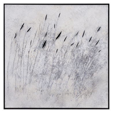 Mit zarten Farbschichten, Linien und zum Teil sogar geöffneten Leinwänden entstehen Werke,